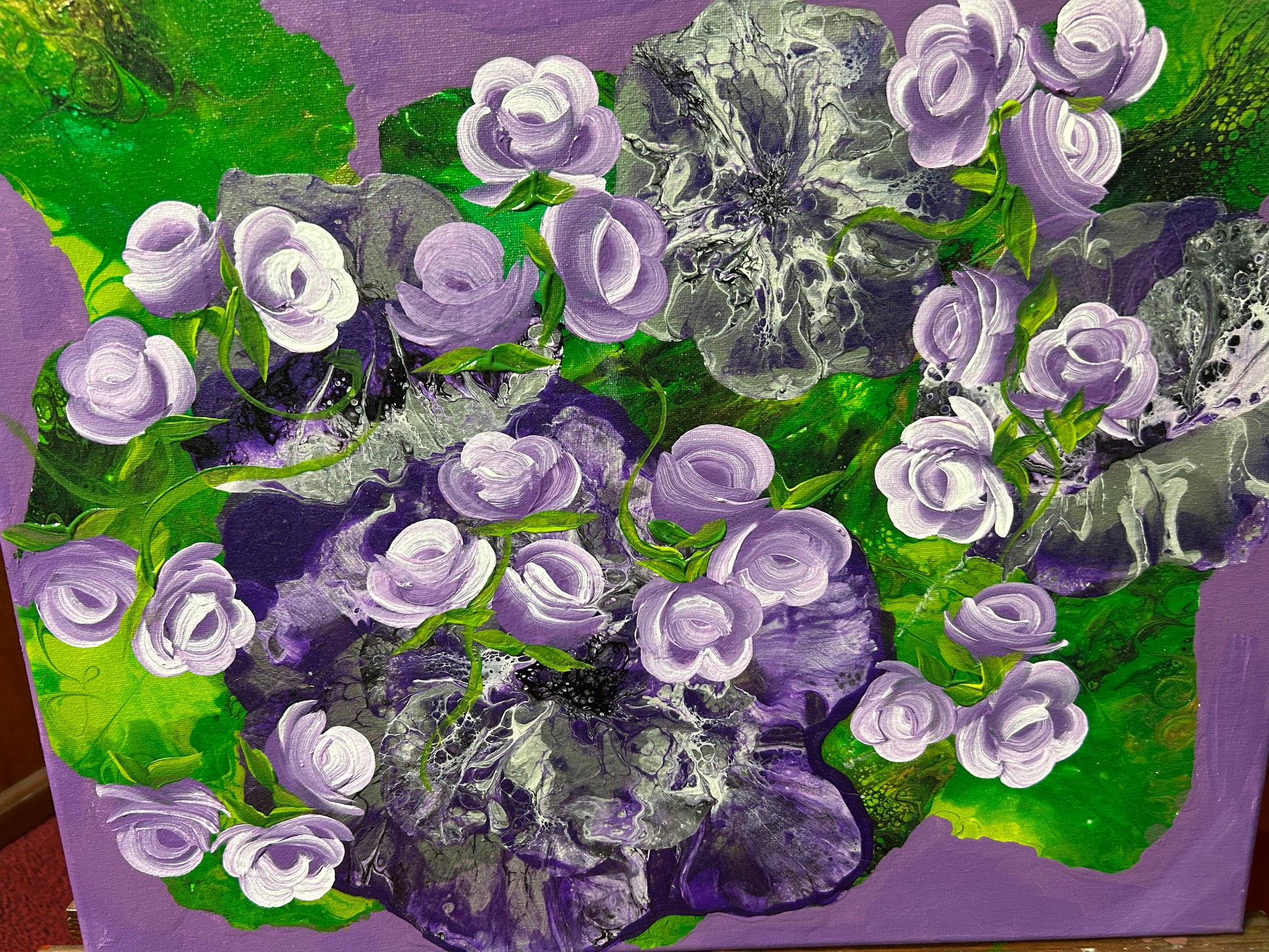 This is one of my older canvas's that I recently embellished with hand painted roses. The original piece was poured onto the canvas. In Mixed media. But I like the roses, that gives it that abstract look.